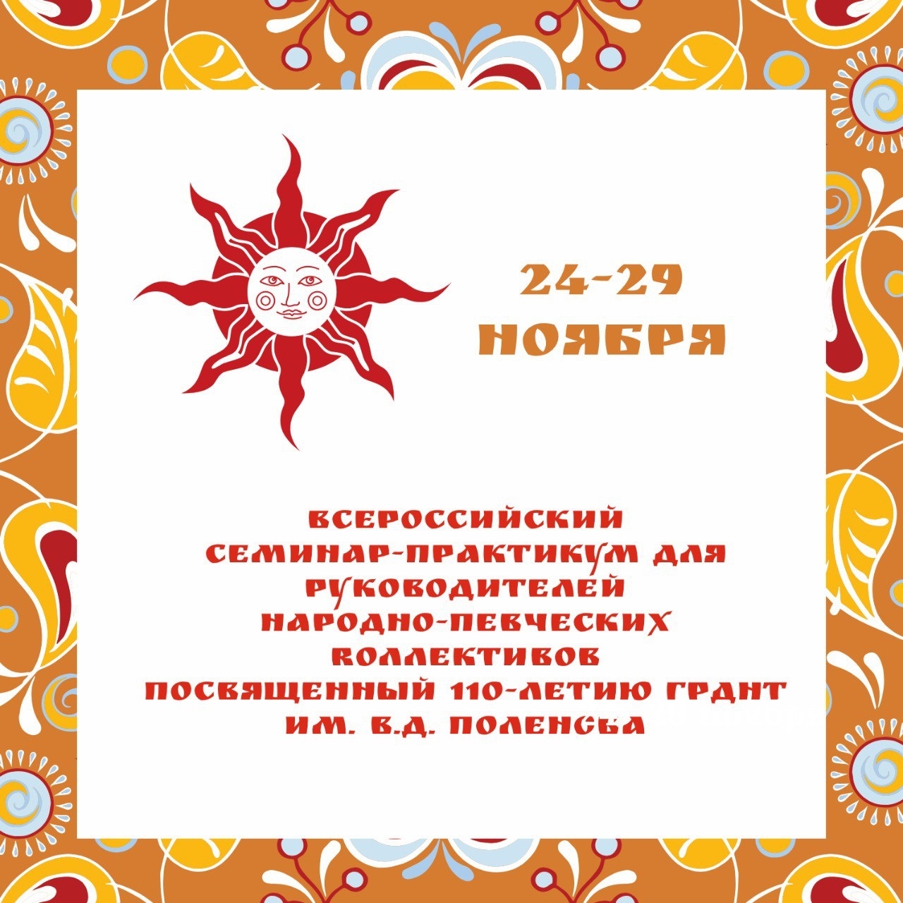 В соответствии с планом учебных мероприятий Государственного Российского Дома народного творчества имени В.Д. Поленова, 24-28 ноября в г. Москве проводится Всероссийский семинар-практикум для руководителей народно-певческих коллективов, посвященный 110-летию ГРДНТ им. В.Д. Поленова.